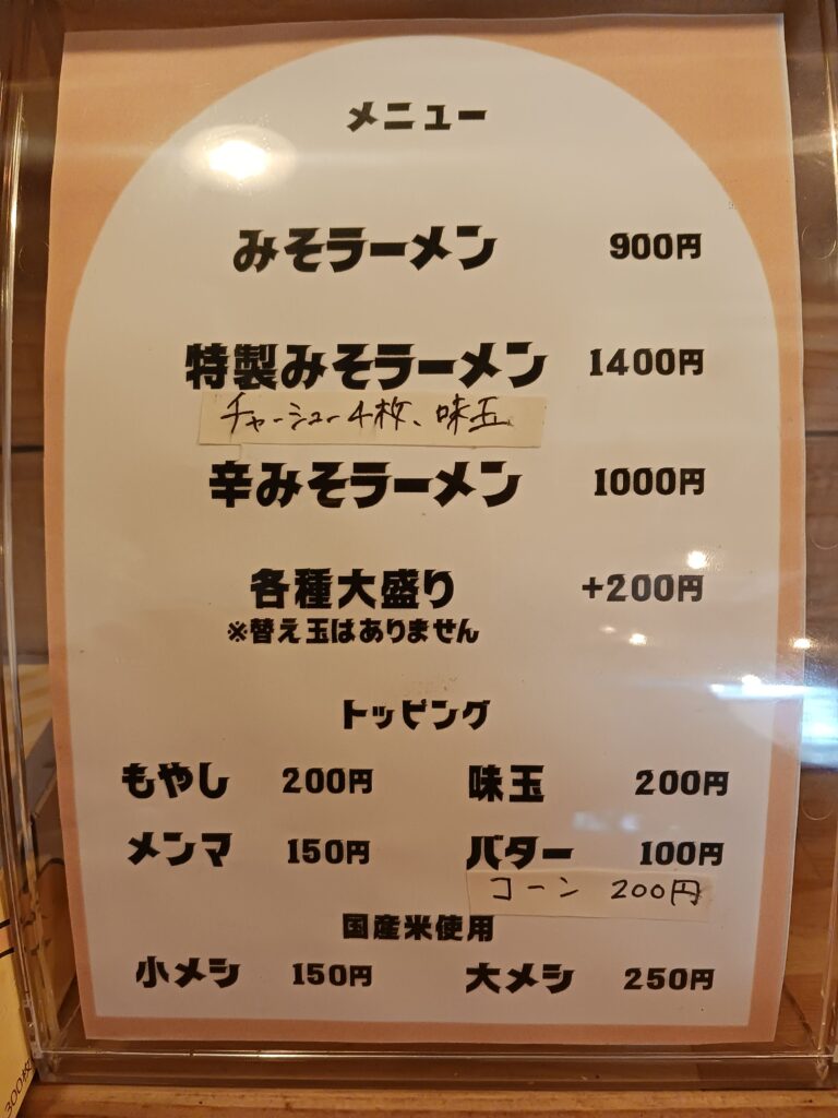 メニューは味噌ラーメンを中心とした構成で、基本の「みそラーメン」900円から、チャーシューが4枚に増量、かつ味玉が追加された「特製みそラーメン」1400円、そして「辛みそラーメン」1000円まで展開。トッピングも充実しており、もやし200円、味玉200円、メンマ150円など手頃な価格設定。各種大盛りが+200円で楽しめるのも嬉しいポイントです。注文時にはバターをトッピングしようか迷いましたが、シンプルに味わいたかったのでトッピングは無し。