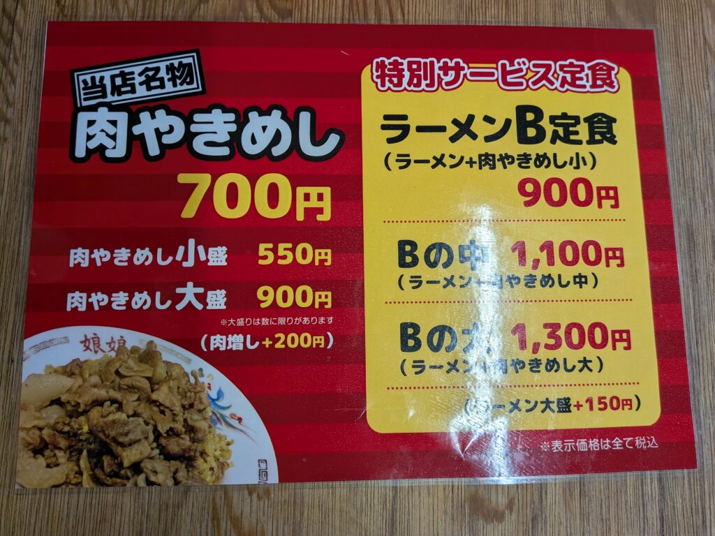 これがメニューです。定番の肉やきめしが食べたかったので特別サービス定食 Bの中(ラーメン+肉やききめし中)にしました。