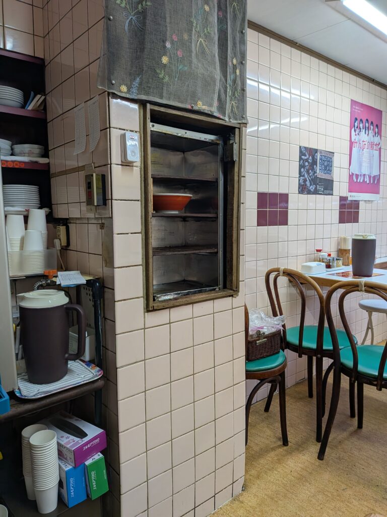 しばらく待っていると電動オカモチで1階から2階まで料理が運ばれてきます。電動オカモチは3つ程料理が乗るようになっており2階に到着する少し前に店員が上がってきます。